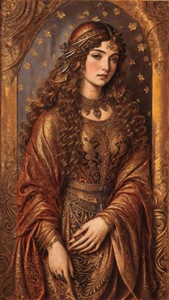 (masterpiece, top quality, best quality, official art, beautiful and aesthetic:1.2), (1girl), long curly hair, high-end dress, extreme detailed,colorful,highest detailed, official art, unity 8k wallpaper, ultra detailed, beautiful and aesthetic, beautiful, masterpiece, best quality, (zentangle, mandala, tangle, entangle) ,holy light,gold foil,gold leaf art,glitter drawing,mj,Renaissance