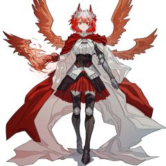 (masterpiece:1.3), (the best quality:1.2), (super fine illustrations:1.2), (Masterpiece), high quality, high detail,((white background:1.2)), looking at viewer, (SOLO:1.4),outline,,simple background,red wings, armored boots, gradient hair, shoulder armor, breastplate, corset, hooded cloak, belt, tail, bird, thighhighs, red skirt, red cape, gauntlets, embers, boots, armor,short hair,hair ornament,red eyes,bangs,hair between eyes,multicolored hair,white hair,jewelry,red hair,long sleeves,gem,streaked hair, short hair,gradient hair,feathers, animal ears, floating hair, phoenix, fiery hair, fiery wings, flaming eye,1girl, breasts, brown eyes, cape, earrings, fire, jewelry, shirt, short hair, skirt,