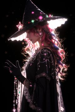 -1girl,  hat,  witch hat,  solo,  jewelry,  long hair,  earrings,  witch,  star (symbol),  profile,  gloves,  red eyes,  black gloves,  gem,  black background,  from side,  upper body,  pink hair,  dress,  multicolored hair,  long sleeves,  hat ornament,  wavy hair,  glowing, coloured glaze,<lora:EMS-85289-EMS:0.800000>