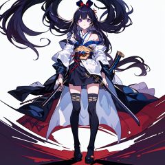 (masterpiece:1.3),(the best quality:1.2),(super fine illustrations:1.2),(Masterpiece),high quality,high detail,(white background:1.2),looking at viewer,(SOLO:1.4),outline,simplebackground,, sarashi,weapon,high heels,armor,hair ornament,hair ribbon,boots,japanese armor,skirt,kimono,off shoulder,ponytail,japanese clothes,black legwear,ribbon,sheathed,sheath,tanzaku,thighhighs,katana,bangs,glowing eyes,hair between eyes,purple eyes,