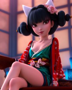 <lora:宝青坊主:0.8>,1girl,solo,animal ears,hair bun,double bun,short kimono,animal ears,black hair,looking at viewer,bangs,sash,crossed legs,