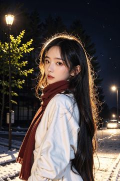 a girl,red wavy long curly hair, beautiful and detailed eyes, scarf, sweater, winter, snowing, standing under the street lamp, upper body, night, night, backlighting,kamisama,