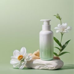 green(style),Bottle, white flower, white tea flower, water, beach, stone, gradient background, light green background, high detail, simple, Advanced, environment, Huge flowers