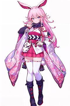 8k, best quality, masterpiece, (ultra-detailed:1.1), (high detailed skin), (full body:1.2), white background, standing, looking at viewer, (solo:1.3), hand on hip, <lora:wunv-v100:0.8:lbw=OUTALL>, wunv, white thighhighs, chihaya (clothing), (long animal ears), (rabbit ears:0.8), fox mask, boots, pink hair, mask, long hair, pink skirt, japanese clothes, bangs, (white background, simple background:1.4), <lora:EnvyBetterHands LoCon_beta2 辅助:0.55>, ( good hands, nice hands:0.5), (beautiful_face), ((intricate_detail)), clear face, ((finely_detailed)), fine_fabric_emphasis, ((glossy)), full_shot,