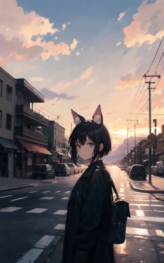 1girl, black_hair, animal_ears, solo, short_hair,sunset, power_lines, sky, scenery, utility_pole, cloud, outdoors, building, city, city_lights, road_sign