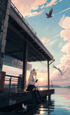 bird,dove,seagull,(1girl),flock, long_hair, twintails, pigeon, animal, bird_on_head, very_long_hair, floating_hair, detached_sleeves, sky, solo, skirt, thighhighs, cloud, necktie,cellphone, phone,smartphone, green_eyes, blonde_hair, long_hair, solo, food, blush, holding_phone,cloud, sky, day, cloudy_sky, scenery, blue_sky, outdoors, tree, no_humans, grass, power_lines,cloud, cloudy_sky, sky, scenery, blue_sky, day, tree, building, no_humans, city, horizon, outdoors, cityscape, ocean, sunset, water, mountain, road, bridge, skyscraper, power_lines, condensation_trail, railing,looking  afar,sitting