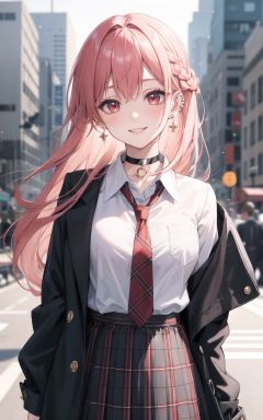 ((best quality)),(masterpiece:1.1),HD,high quality,8k,1girl, necktie, jewelry, long_hair, earrings, braid, smile, choker, plaid, solo, piercing, ear_piercing, red_eyes, blurry, looking_at_viewer, skirt, plaid_skirt, shirt, depth_of_field, jacket, white_shirt, very_long_hair, black_choker, collared_shirt, school_uniform