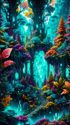 (Fantasy style: 1.5) Object perspective, changeable colors (Fantasy Architectural World) Hyper-realistic style (intricate details) A psychedelic forest sea lives among the peaks of the Soul Mountain. The trees are like mysterious veins of life, spreading from the foot of the mountain to Mountain top. This forest is full of exotic plants that sway in the breeze, adding a layer of mysterious vitality to the entire mountain range.