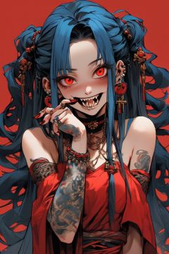best quality, masterpiece, by rolua, 1girl, solo, hair rings, chain, yellow eyes, blue hair, red background, long hair, looking at viewer, braid, jewelry, open mouth, hair ornament, fangs, bangs, teeth, mole, dress, simple background, black nails, fingernails, cross, bare shoulders, chinese clothes, upper body, nail polish
