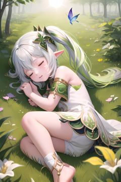 nahidadef lies on the ground, curled up like a baby, closed eyes, 5 years old, gloom, forest, grass, flowers, cute animals, birds, butterfly, (sun), sunlight, (dazzle:1.2),watercolor