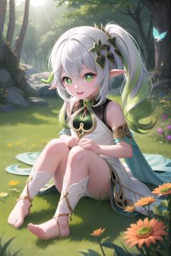 nahidadef lies on the ground, curled up like a baby, 5 years old, gloom, forest, grass, flowers, cute animals, birds, butterfly, (sun), sunlight, (dazzle:1.2),watercolor,masterpiece