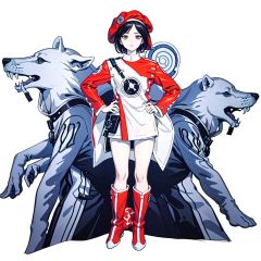 (masterpiece:1.3), (the best quality:1.2), (super fine illustrations:1.2), (Masterpiece), high quality, high detail,((white background:1.2)), looking at viewer, (SOLO:1.4),outline,,simple background, dress, red shirt, white footwear, hat, boots, red headwear,
