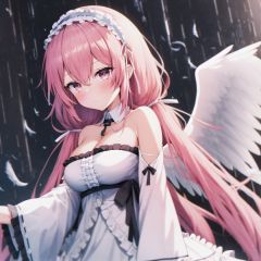 pink hair, key necklace, hairband, 1girl, solo, long hair, breasts, blush, bangs, long sleeves, dress, cleavage, hair between eyes, bare shoulders, twintails, medium breasts, very long hair, closed mouth, outdoors, frills, detached sleeves, wings, hand up, wide sleeves, pink eyes, white dress, strapless, frilled dress, feathered wings, rain, white sleeves, angel wings, white wings,<lora:EMS-86654-EMS:0.800000>