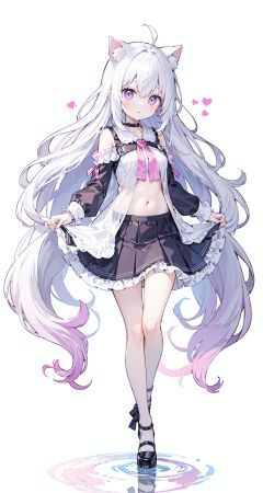 ,(loli:1.2),(petite:1.2),((masterpiece, best quality)),1girl,solo,cuty face,Beautiful detailed eye,full body,standing,dynamic pose,ray tracing,Reflected light,(very detailed light),(Beautiful Lighting)++++(best quality), [(white background:1.4)::10], [(Lake and forest background:1.2):5],masterpiece, best quality,medium breast,bust,best quality,beautiful detailed eyes,(white hair:1.4),(pink gradient hair:1.2),wavy hair,disheveled hair,cat ears,messy hair, long bangs, hairs between eyes,extremely detailed, floating hair,highleg,solo, best quality, masterpiece, highres, original, extremely detailed wallpaper,{an extremely delicate and beautiful},heart antenna hair,purple eyes,navel, {beautiful eyes},midjourney