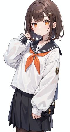 solo, 1girl, sleeves past wrists, school uniform, sleeves past fingers, skirt, simple background, bangs, hair ornament, serafuku, white background, short hair, parted lips, pleated skirt, long sleeves, muted color, neckerchief, brown hair, sailor collar, black skirt, blunt bangs, cowboy shot, orange eyes, black sailor collar, looking at viewer