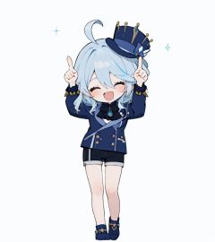 1girl,solo, <lora:char-furina:0.95> ,mini hat, ahoge, closed eyes,blue jacket,shorts,gem, ascot, double-breasted, ,, open mouth, <lora:Internet Yamero-UP:0.75> ,smile, chibi, full body, internet yamero, smile, open mouth, finger raised, ^ ^, closed eyes, simple background