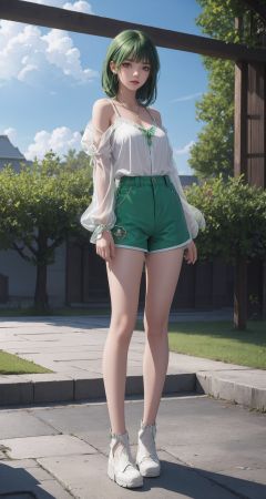 1girl,full body,masterpiece,best quality,highly detailed,green hair,dolphin shorts