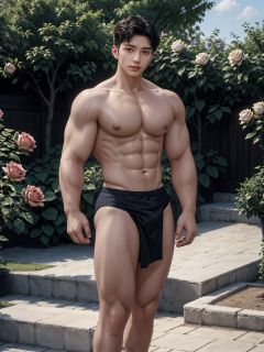 masterpiece,1 male,Look at me,Topless,Short hair,Greek dress,Shrine,Fairy tales,Outdoor,Rose garden,Poseidon,textured skin,super detail,best quality,