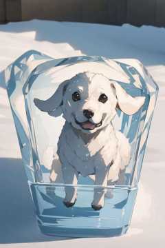 1 dog frozen in a ice block,<lora:frozen_squirrel_v3_64:0.6>,