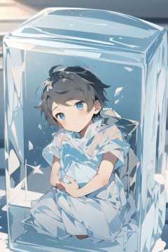 1 boy frozen in a ice block,<lora:frozen_squirrel_v3_64:0.6>,