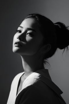 1girl,spotlight,silhouette,parted lips,looking at viewer,monochrome,portrait,deatailed beautiful face,hair bun,simple background,dark background,, silhouette,light master
