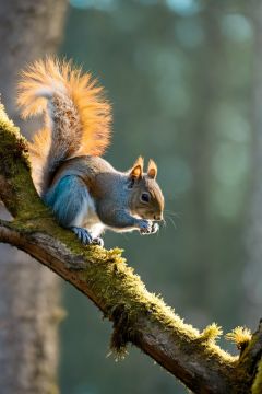 The smallest, cinematic, squirrel in the tree, forest lake, moss, cold weather, deep cyan and amber, Sony A7 IV, xsgb,light master