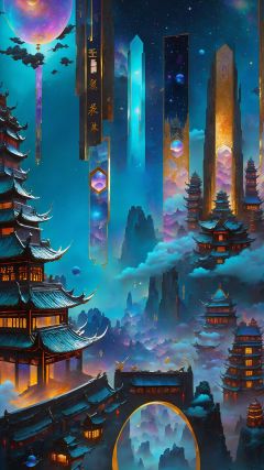 (Chinese gilding style: 1.5) Ancient rhyme color (cosmic perspective) Surrealism, intricate details, above the clouds, a dreamy fairy city floats in the void. Strange runes are carved on the city walls, and the buildings in the city are as transparent as crystal and emit colorful neon lights, as if they are in a fairyland.