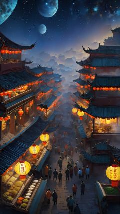 (Chinese ancient rhyme style: 1.5) Ancient rhyme color (cosmic perspective) Surrealism, intricate details, the aroma of ancient spices and herbs wafting in the night market starry sky. In front of the food stalls, traditional guzhengs are placed. The buildings of the ancient capital are like the ancient streets of the Ming and Qing Dynasties. The night market has become a gathering place for classical literati.