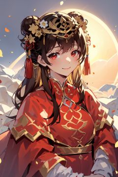 -1girl, solo, red eyes, chinese clothes, hair ornament, smile, flower, long hair, bangs, hair bun, jewelry, hair flower, upper body, black hair, brown hair, dress, long sleeves, blunt bangs, closed mouth,Chinese weddingdress,<lora:Chinese weddingdress-000018:0.8>
