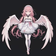 pink hair, key necklace, hairband, 1girl, solo, long hair, looking at viewer, blush, bangs, simple background, red eyes, long sleeves, dress, hair between eyes, bare shoulders, very long hair, standing, collarbone, full body, pantyhose, frills, parted lips, detached sleeves, wings, shoes, wide sleeves, pink eyes, white dress, :o, collar, sleeves past wrists, strapless, frilled dress, black background, red footwear, strapless dress, feathered wings, white pantyhose, white sleeves, angel wings, white wings, pink footwear, frilled hairband,pink hair