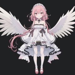 pink hair, key necklace, hairband, 1girl, solo, long hair, looking at viewer, blush, bangs, simple background, red eyes, long sleeves, dress, hair between eyes, bare shoulders, very long hair, standing, collarbone, full body, pantyhose, frills, parted lips, detached sleeves, wings, shoes, wide sleeves, pink eyes, white dress, :o, collar, sleeves past wrists, strapless, frilled dress, black background, red footwear, strapless dress, feathered wings, white pantyhose, white sleeves, angel wings, white wings, pink footwear, frilled hairband