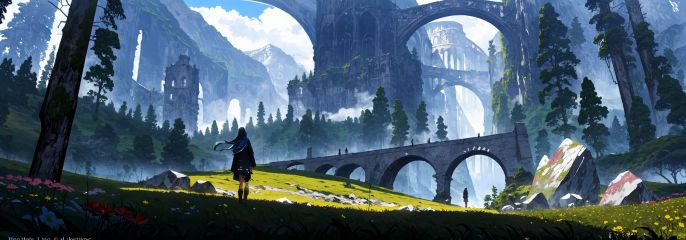 ((best quality)), ((masterpiece)), ((ultra-detailed)), (illustration), (detailed light), (an extremely delicate and beautiful),(Negative space),incredibly_absurdres,(ray tracing),(glowing light),(day),(solo:2),(1girl),(((full body shot))),((standding)),((facing away)),(hands in pockets),(+perfect hand+:1.21),(((coat))),((beautiful dress+knee boots)),((Belts)),(scarf),(leg loops),(((long hair))),(English text:1.1),((beautiful sky)),(scenery),((mountain)),((floating island)),(cloud),((nature)),(grass),(flower meadow),((fog)),(pine),(flower),(stone),(rock),((huge tower)),(building_ruins),(Bridge),(Center Epic Building),(moss),(alpine),