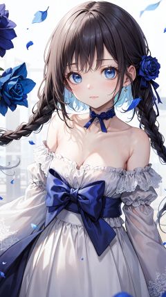 ((best quality)),(masterpiece:1.1),HD,high quality,8k,blue_flower, blue_rose, flower, 1girl, rose, solo, blue_eyes, long_hair, braid, blue_ribbon, dress, blue_bow, looking_at_viewer, white_dress, petals, blurry, collarbone, bangs, bare_shoulders