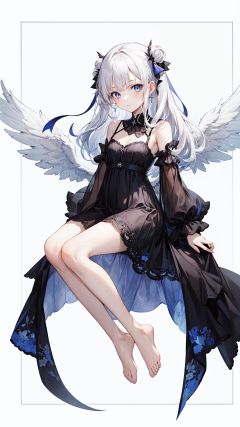 wings, 1girl, solo, long hair, barefoot, blue eyes, angel wings, white background, looking at viewer, feathered wings, dress, white hair, bangs,border