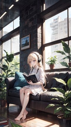 extremely delicate and beautiful, depth of field, amazing, masterpiece, growth, visual impact, ultra-detailed, 1girl, long_hair, Modernist style architecture, window, book, pillow, barefoot, solo, plant, very_long_hair, indoors, potted_plant, headphones, cup, gorgeous, fantasism, nature, refined rendering, original, contour deepening, high-key and low-variance brightness scale, soft light, light and dark interlaced