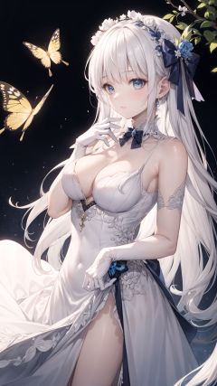 finely detail,Depth of field,(((masterpiece))),((extremely detailed CG unity 8k wallpaper)),best quality,high resolution illustration,Amazing,intricate detail,(best illumination, best shadow, an extremely delicate and beautiful),1girl,long_hair,white hair,(hair accessories),cleavage,Brooch,Exquisite ornaments,clear,crystal chains decorate,Iris proantha,(white evening dress:1.4),bird,collarbone,butterfly,blue_eyes girdling,bow tie,ribbon,shawl,Long gloves and short gloves,The bird stands on the back of its hand,