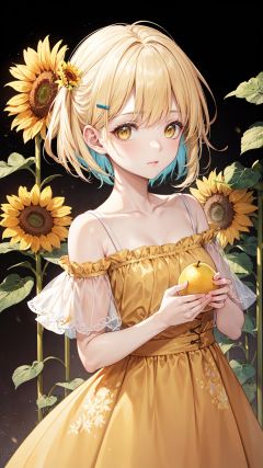 finely detail, Depth of field, (((masterpiece))), ((extremely detailed CG unity 8k wallpaper)), best quality, high resolution illustration, Amazing, intricate detail, (best illumination, best shadow, an extremely delicate and beautiful), yellow_background, yellow_theme, lemon, 1girl, yellow_sky, gradient_background, solo, lemon_slice, gradient, hair_ornament, dress, yellow_dress, bubble, yellow_eyes, fruit, food, short_hair, multicolored_background, sunflower, hairclip, moon, collarbone