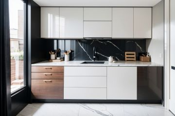 Kitchen, white marble walls, marble floor, Ash black cabinets, metallic texture,