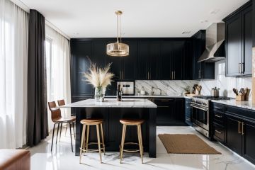 Kitchen, white marble walls, marble floor, black cabinets, metallic texture,