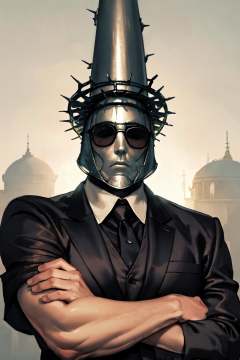 masterpiece, (detailed, highres, best quality), 1boy <lora:sppenitentOne-08:1>, penitentonedef, helmet, stone face, faceless, black tuxedo, sunglasses