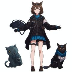(masterpiece:1.3), (the best quality:1.2), (super fine illustrations:1.2), (Masterpiece), high quality, high detail, ((white background:1.2)), looking at viewer, (SOLO:1.4), outline, , simple background,uniform, gloves, bare leg, logo, thigh, thighhighs, black headwear, tail, cellphone, miniskirt, neckerchief, black headband, clothes writing, armband, cat ears, thigh strap, thigh holster, shoes, short hair, pleated skirt, jacket, hairband, full body, brown hair, brown eyes, blue skirt, black footwear, bangs, animal ears