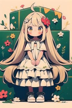 tuyagirl,1girl, solo, long hair, sitting, dress, looking at viewer, blush, hair ornament, white footwear, shoes, white dress, white hair, short sleeves, full body, hair flower, box, flower, closed mouth, ahoge, blonde hair, very long hair, layered dress