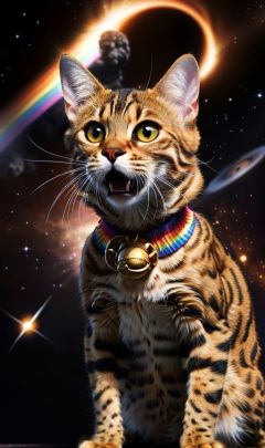 Best quality,ultra high res,detailed background,AP,Bengal cat,cat,With a bell around his neck,no humans,open your mouth,(in the universe:1.3),(Galaxy:1.1),(Planet:1.2),wearing superhuman clothes,There are meteorites around,explosion,black hole explosion,ship,starry_sky,<lora:MG_宠物之家_V1.0:0.35>,wearing clothes,earth,<lora:Bengal ocelot:0.65>,watching the audience,(backlight:1.2),meteor,star collar,(rainbow:1.2),