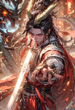 (tmasterpiece), (Best quality at best), Cinematic quality,Rendered by Octane,Ultra-detailed details,1 boy,Face of a young man,Facial detail portrayal,Perfect facial features,(The air is filled with silver metal:1.5),staredown, watch audience, (Ancient Chinese Hanfu:1.2),(Full body lesbian:1.3), (holding a longsword:1.2), (Behind him,Featuring a giant black metal dragon,:1.5)