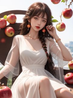 1girl, solo, long_hair, breasts, looking_at_viewer, blush, bangs, brown_hair, hair_ornament, red_eyes, dress, hair_between_eyes, jewelry, medium_breasts, closed_mouth, braid, short_sleeves, earrings, lying, parted_lips, food, hand_up, on_back, nail_polish, black_dress, bracelet, see-through, fruit, apple, see-through_sleeves, grapes, orange_\(fruit\), red_apple
