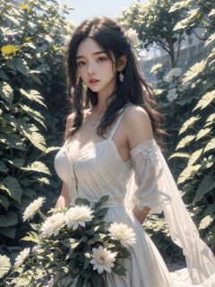 masterpiece, 1 girl, 16 years old, Maiden, Look at me, Lovely, Long hair, Black hair, Outdoor, Garden, Soft light, Angel, White broken flower skirt, Huge flowers, textured skin, super detail, best quality, 8k