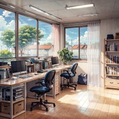 background, scenery, no humans, window, book, sky, chair, desk, cloud, curtains, globe, tree, day, computer, bookshelf, indoors, paper, shelf, sunlight, bag, blue sky, plant, wooden floor, office