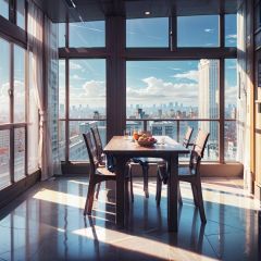 background, window, no humans, scenery, indoors, chair, cloud, building, sunlight, sky, cityscape, shadow, day, window shade, checkered floor, blue sky, skyscraper, city, table