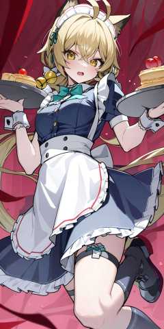 (masterpiece:1.2),best quality,PIXIV,Energetic girl,1girl,solo,bow,animal ears,blue bow,food,apron,blonde hair,maid,yellow eyes,long hair,short sleeves,dress,holding,bell,tail,hair bow,maid headdress,looking at viewer,ahoge,frills,puffy sleeves,black dress,socks,bangs,wrist cuffs,puffy short sleeves,pancake,open mouth,bowtie,maid apron,tray,blue bowtie,white apron,white background,standing on one leg,neck bell,frilled dress,holding tray,jingle bell,thigh strap,breasts,frilled apron,enmaided,fruit,shoes,kneehighs,fang,standing,hair between eyes,