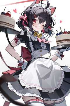(masterpiece:1.2),best quality,PIXIV,Energetic girl,1girl, animal ears, solo, one eye closed, food, cat ears, tail, bow, tongue out, apron, tongue, cat tail, bell, maid, maid headdress, holding, short sleeves, dress, red eyes, hand on hip, cat girl, ahoge, frills, white background, looking at viewer, cake, hair ornament, black dress, black hair, twintails, white apron, heart, thighhighs, puffy sleeves, hair bow, neck bell, maid apron, white thighhighs, bangs, puffy short sleeves, simple background, pink bow, frilled apron, red bow, gloves, jingle bell, ribbon, short hair, smile, frilled dress, white gloves, hairclip, bowtie, short twintails, wrist cuffs, closed mouth, brown hair, blush, holding plate
